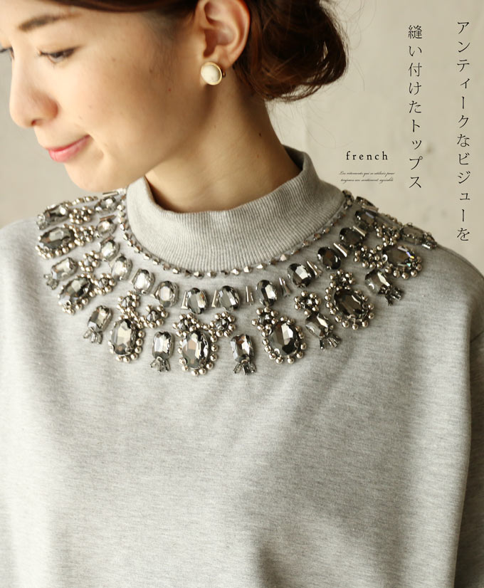 【再入荷♪12月7日12時&22時より】「french」アンティークなビジューを縫い付けたトップス